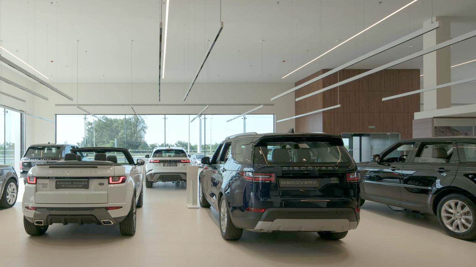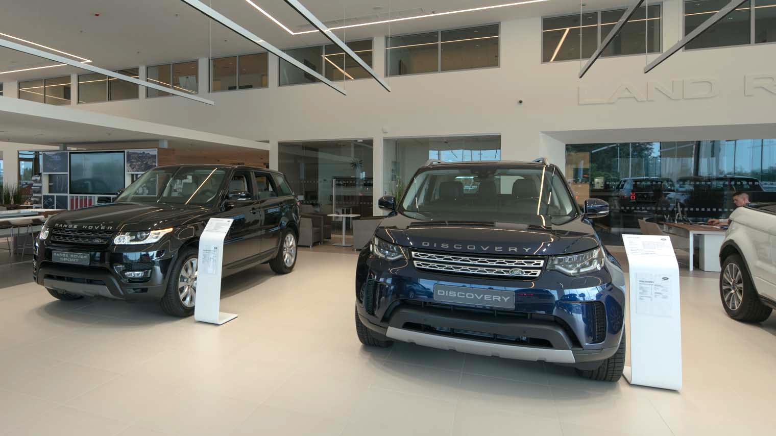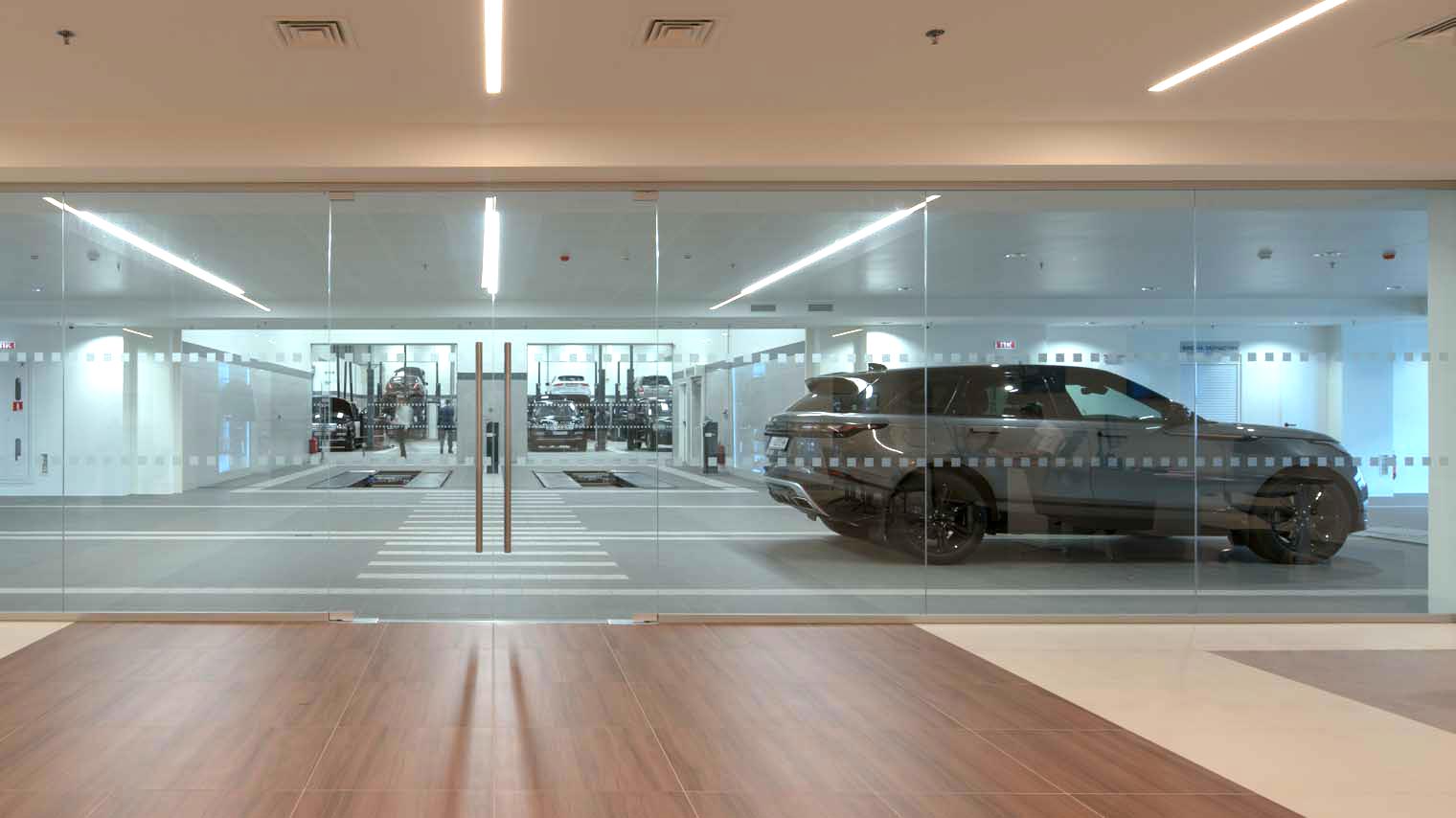 Jaguar Land Rover has introduced a single, two-brand format for Jaguar and Land Rover dealerships. The car dealership provides a deep and cozy atmosphere for their visitors and full caring and service for their cars. Innovative approach, new technology, exquisite British style in a showroom featuring 7 Jaguar cars and 7 Land Rover cars in its territory. The space around the car allows them to “breathe”, and specially designed lighting emphasizes their uniqueness. For the highest level of customer service, new dealerships offer unique advantages: 10 substitutions, airport service and track for off-road testing of cars, so that each customer can fully ensure the best driving performance of Jaguar and Land Rover. Dealer centers are also provided with areas for rest and work: a children’s room, a place for the mother and the child, a barista bar and a comfortable lounge area.