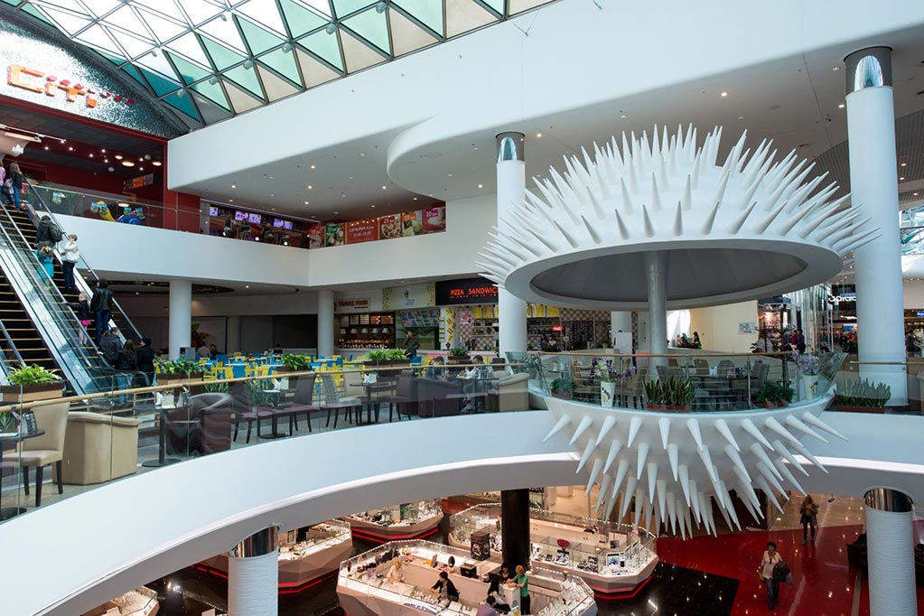 The concept of the interior with a fountain and a public aquarium of 350,000 liters, in which exotic fish swim, was developed in cooperation with the international design bureau Chapman Taylor.